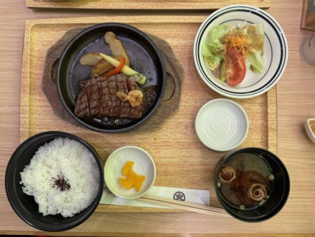 混み合う前に、と早めのランチタイムに到着。ひととおりメニューを拝見したところ、やはり、所長も私も気にかかるのは『限定メニュー』と記載されたもの。所長は『ミニステーキ定食』を、私は『グリル定食』をいただきました。