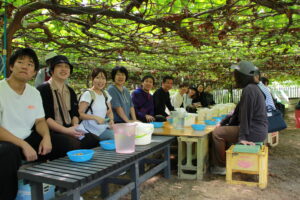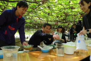 ハサミを手に、部署や年齢に関係なく、みんなでワイワイとぶどうを選ぶ時間は、