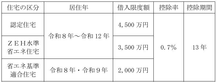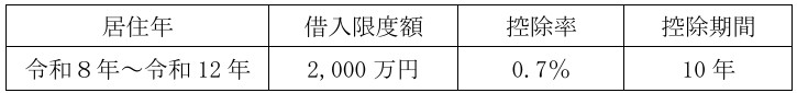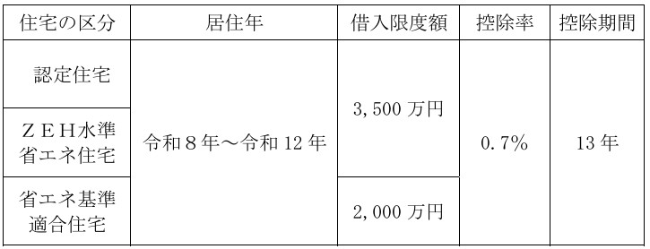 ①住宅の取得等をして令和8年から令和12年までの間に居住の用に供した場合の住宅借入金等の年末残高の限度額(借入限度額)、控除率及び控除期間が次のとおりとされる予定です。