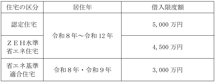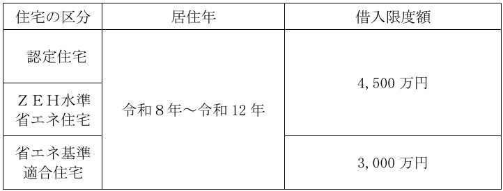 ②特例対象個人が、認定住宅の新築等又は認定住宅等である既存住宅の取得をして令和8年から令和12年までの間に居住の用に供した場合(一定の場合を除きます。)の住宅の借入金等の年末残高の限度額(借入限度額)が次のとおりとして本特例の適用ができることとされる予定です。